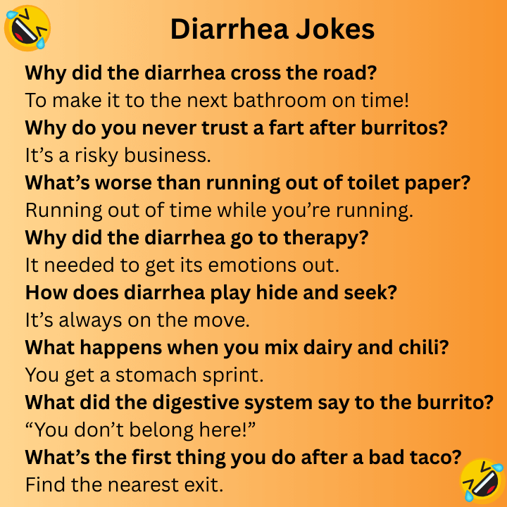 Classic diarrhea jokes rely on simple setups and punchlines that play on urgency, speed, and surprise. These jokes are easy to understand and perfect for casual conversations where light humor is welcome.