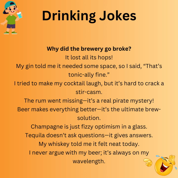 Short drinking jokes deliver quick laughs without slowing the conversation. They’re ideal for texting, party games, or moments when you want humor without a long setup.