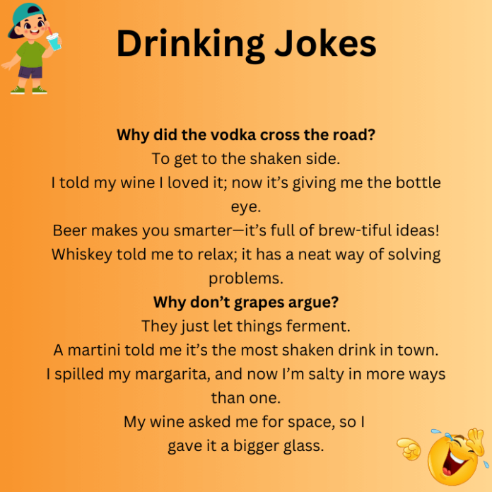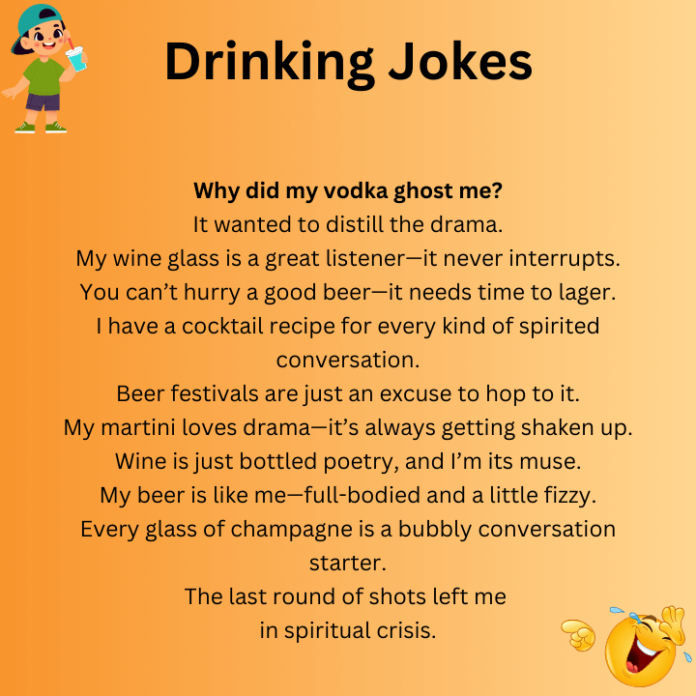 Classic drinking jokes rely on simple wordplay and relatable moments. They’re easy to remember, fun to share, and perfect for any crowd. These jokes work especially well when the drinks are flowing and conversations are lively.