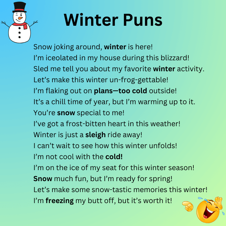 These puns are playful, easy to share, and perfect for brightening someone’s day during the cold months.