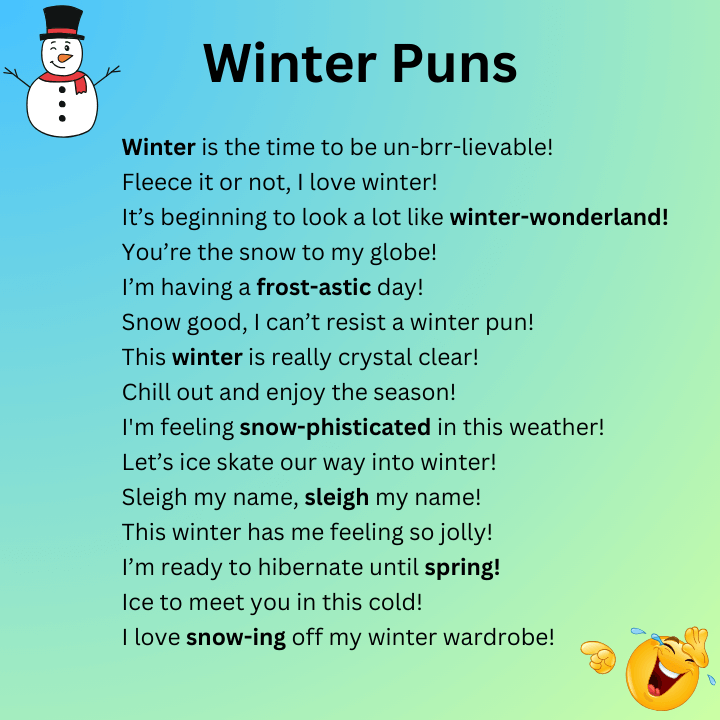 Winter can sometimes feel long, but humor keeps spirits high. These puns are ideal for any winter moment: