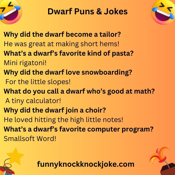 Whether you are looking to share a quick laugh with friends, lighten the mood online, or simply enjoy clever humor, these dwarf puns and jokes offer plenty of smiles. Each joke focuses on harmless fun, creative language, and a cheerful tone that keeps the humor enjoyable and inclusive.