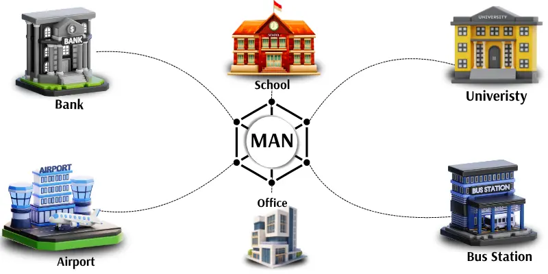 MAN networks span cities, linking multiple LANs for high-speed data sharing. Organizations like banks or city offices use MANs for regional connectivity.