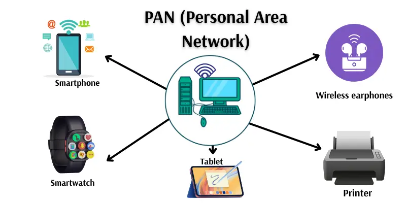 PANs connect personal devices over a short range, typically within a few meters. Common examples include smartphones, tablets, laptops, and Bluetooth devices.
